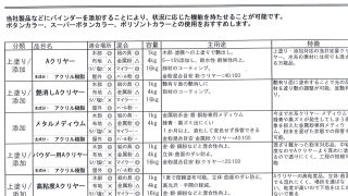 未分類絵の具添加用バインダーの種類 スーパーボタンカラー(原色)には酢酸ビニル樹脂が添加されており、屋内使用で木材や紙に塗る場合はそのまま使用できますが、屋外や布などに塗る場合、バインダーを添加する事により、「耐久性・機能性・作業性」など素材や使用期間に併せてカスタマイズする... 2026.03.16未分類